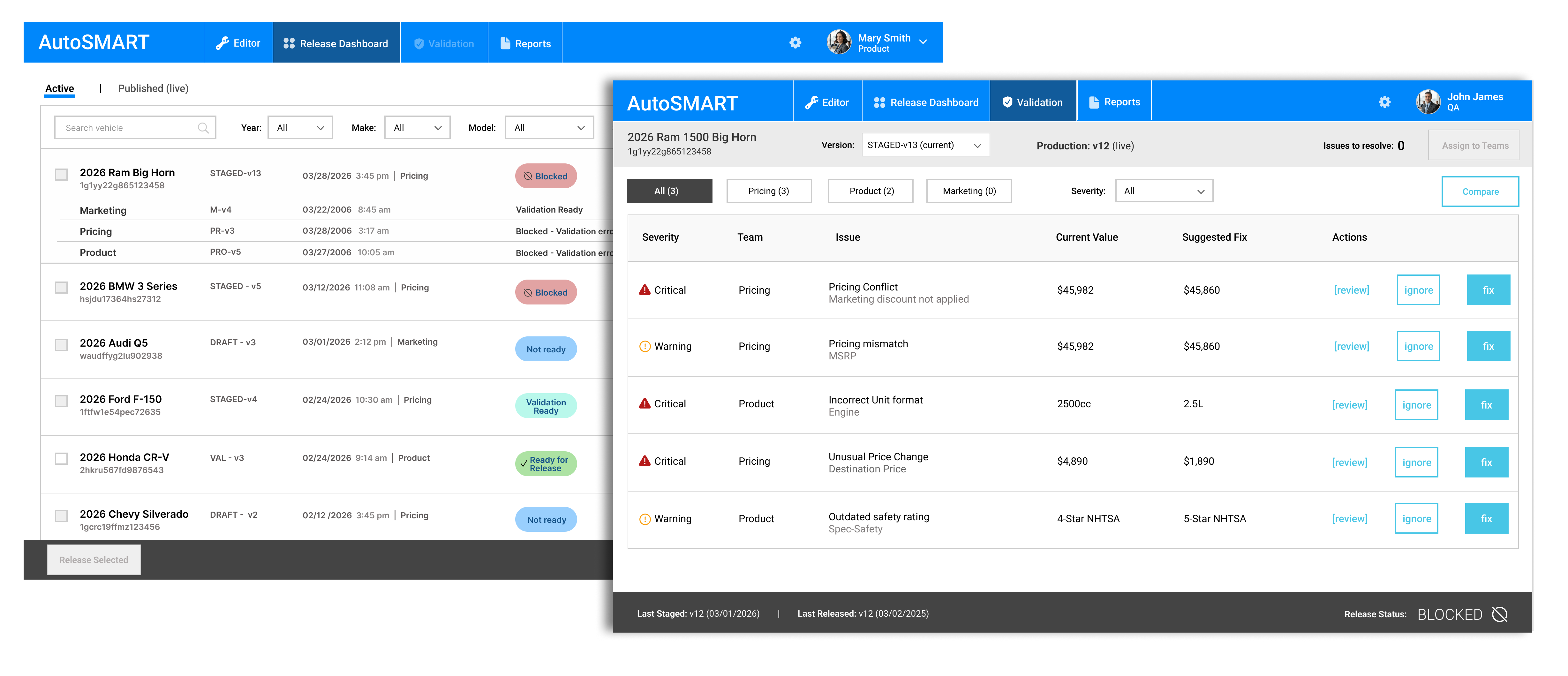 I led UX for a core workflow within an enterprise automotive platform used by marketing, pricing, and product teams to manage vehicle data prior to release. Each team worked on a shared dataset but operated through independent workflows: