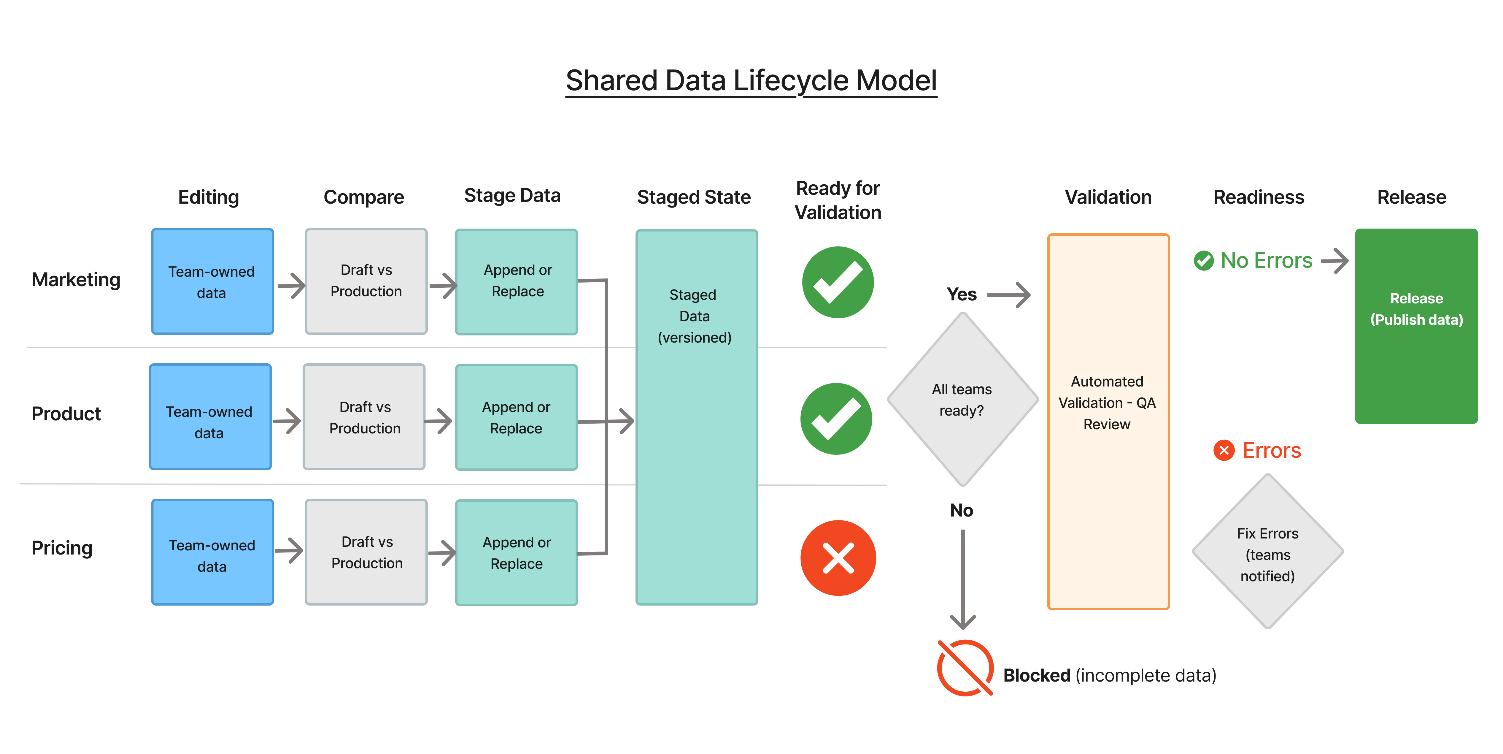 Problem: Multiple teams worked on shared data within the same platform, but the system had no concept of shared state or readiness. Also ownership, while enforced through permissions - was not visible where cross-team coordination was required. This led to version conflicts, manual coordination, and unreliable releases.