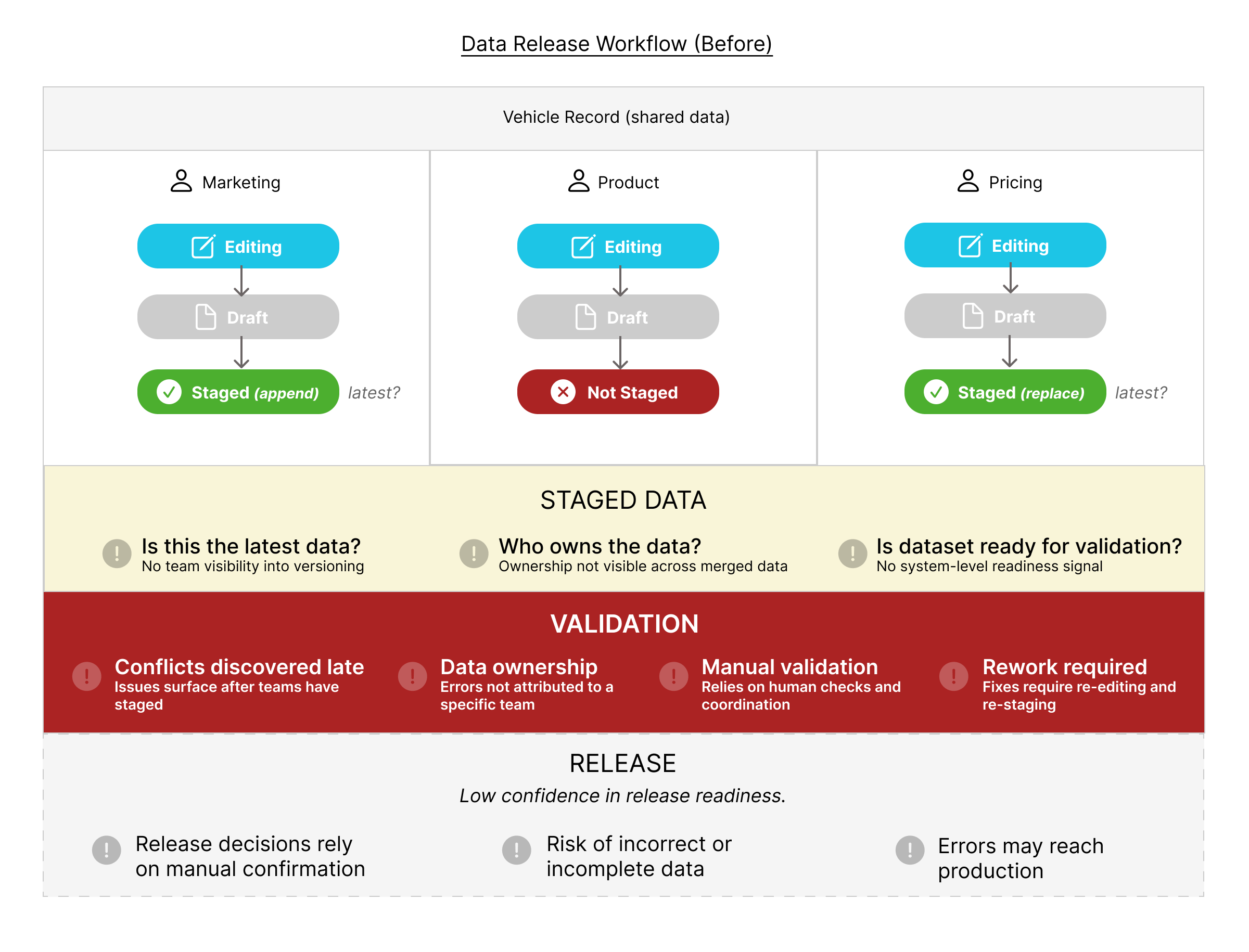 Because these workflows were not connected at a system level, a vehicle record could exist in multiple states simultaneously - partially staged, partially validated, or incomplete. This created significant complexity: