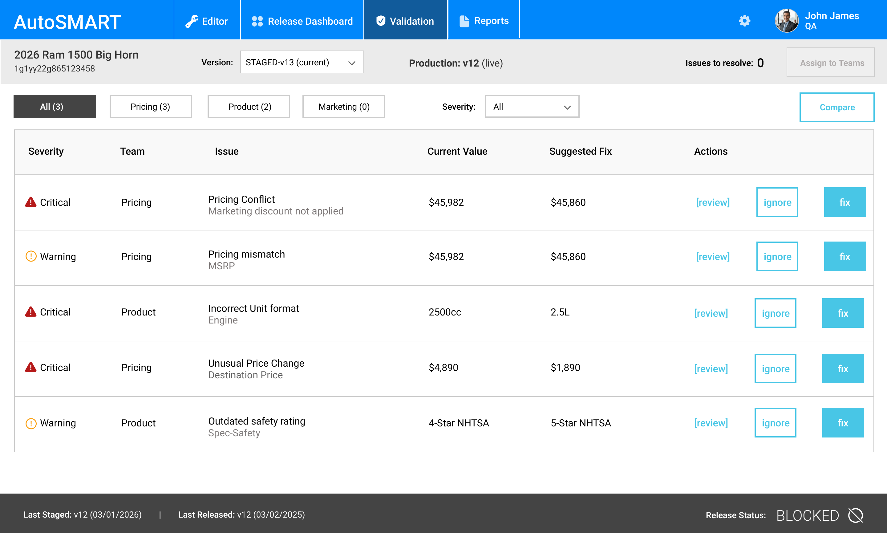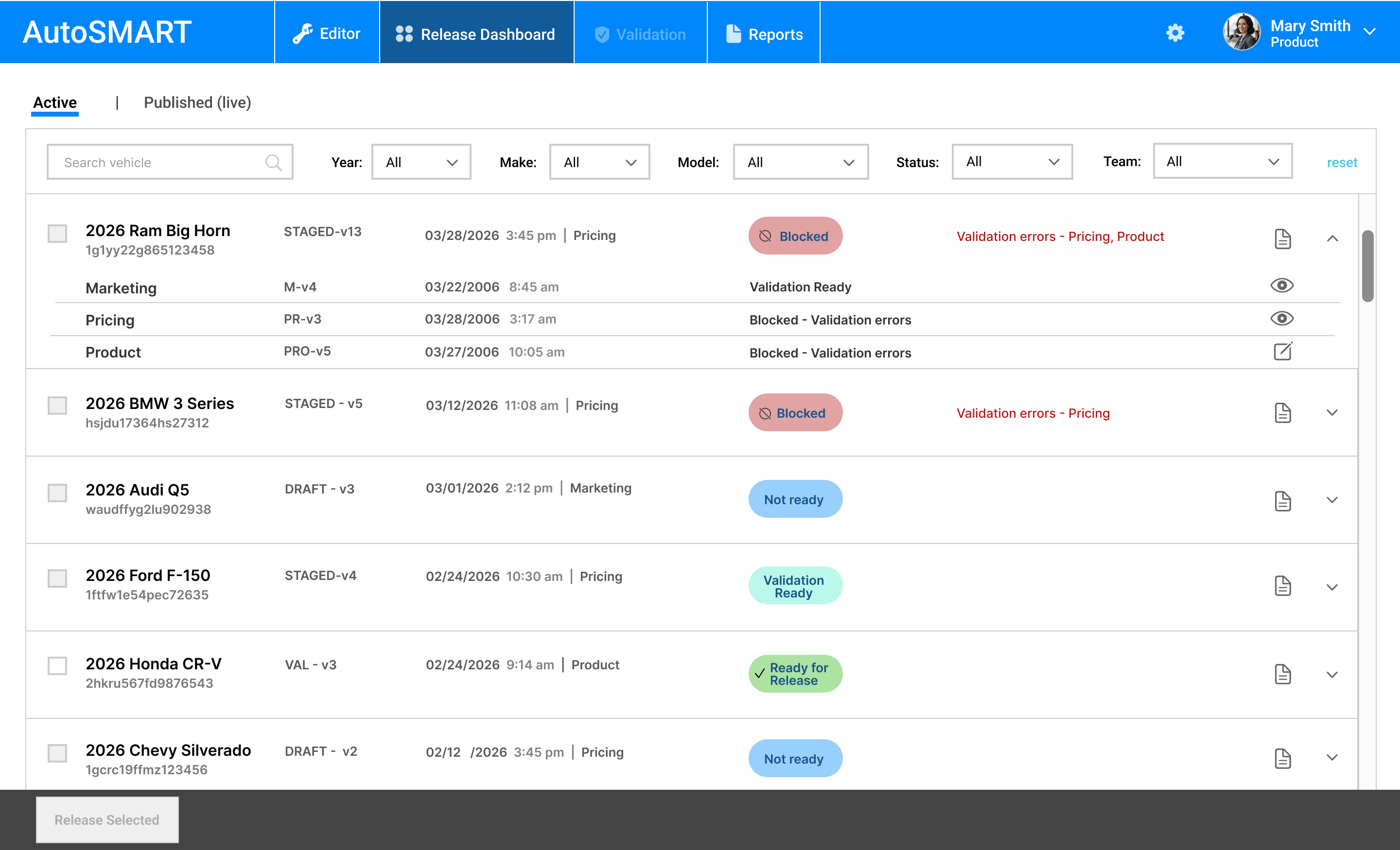 I led UX for a core workflow within an enterprise automotive platform used by marketing, pricing, and product teams to manage vehicle data prior to release. Each team worked on a shared dataset but operated through independent workflows: